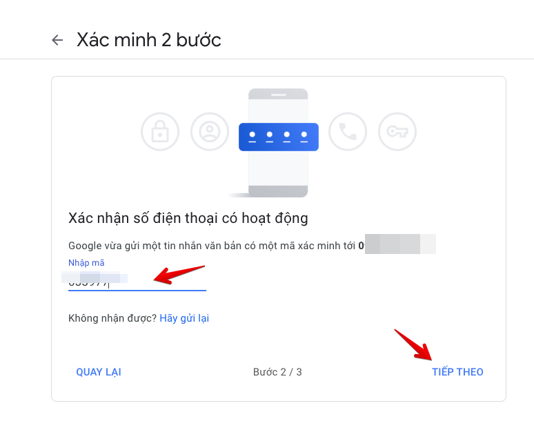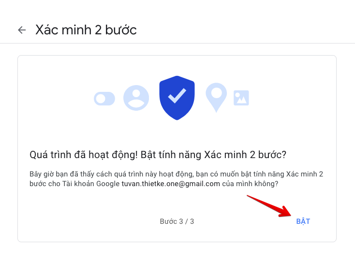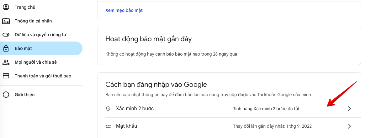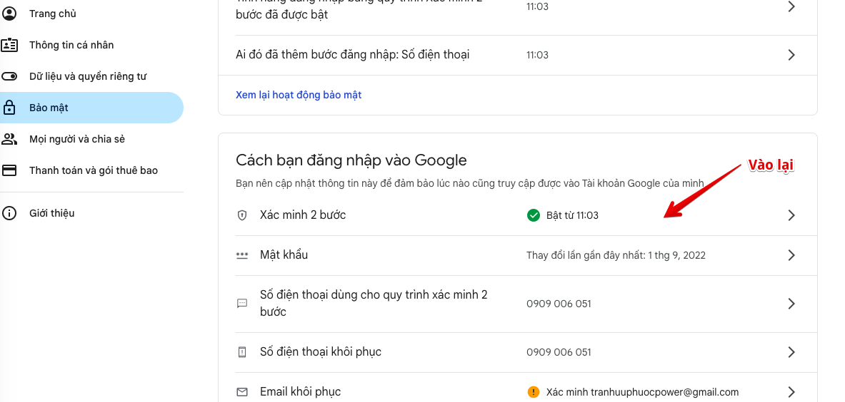 Vào lại Bảo mật >> Xác minh 2 bước như hình
